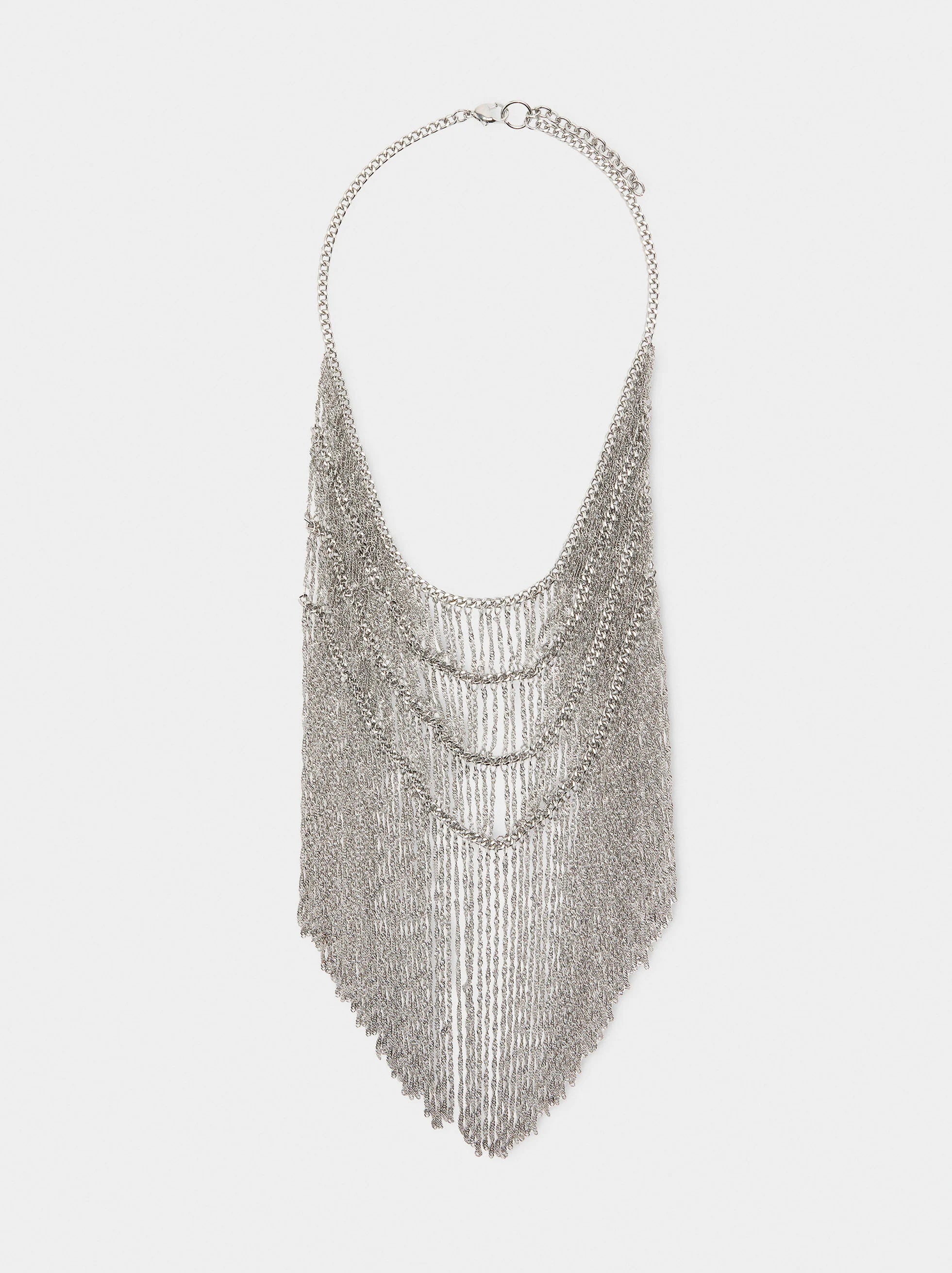 Collar largo tipo babero con multicadenas. Cierre de mosquetón. Acabado plateado en rodio.
