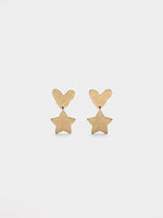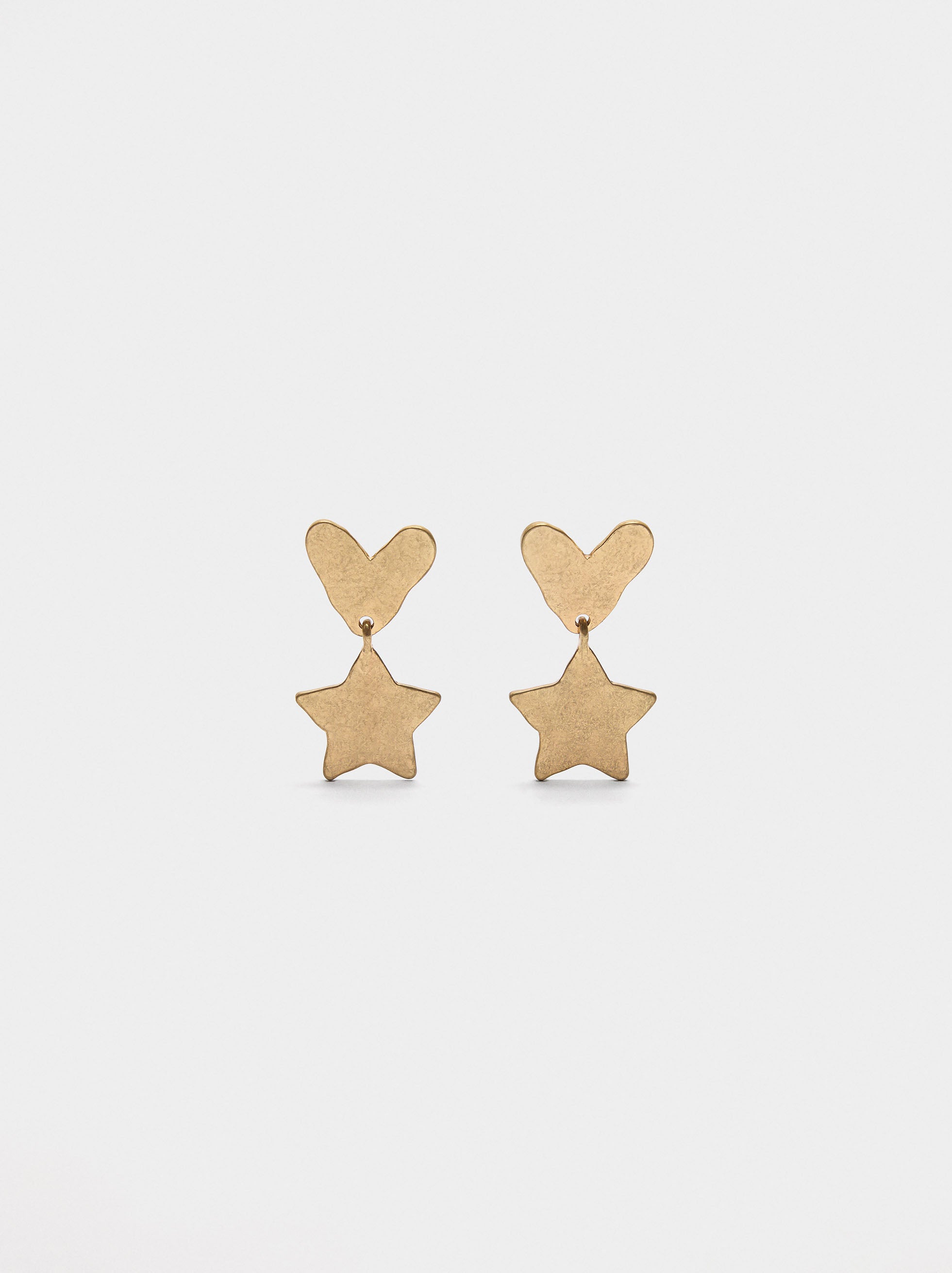 Long earrings with stars and an irregular-shaped heart. Aged effect. Golden finish.