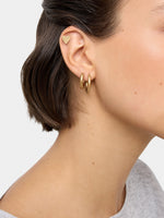 Set of three pairs of earrings: two pairs of tubular hoop earrings; one pair of short earrings in the shape of a heart. Aged effect. Golden finish.