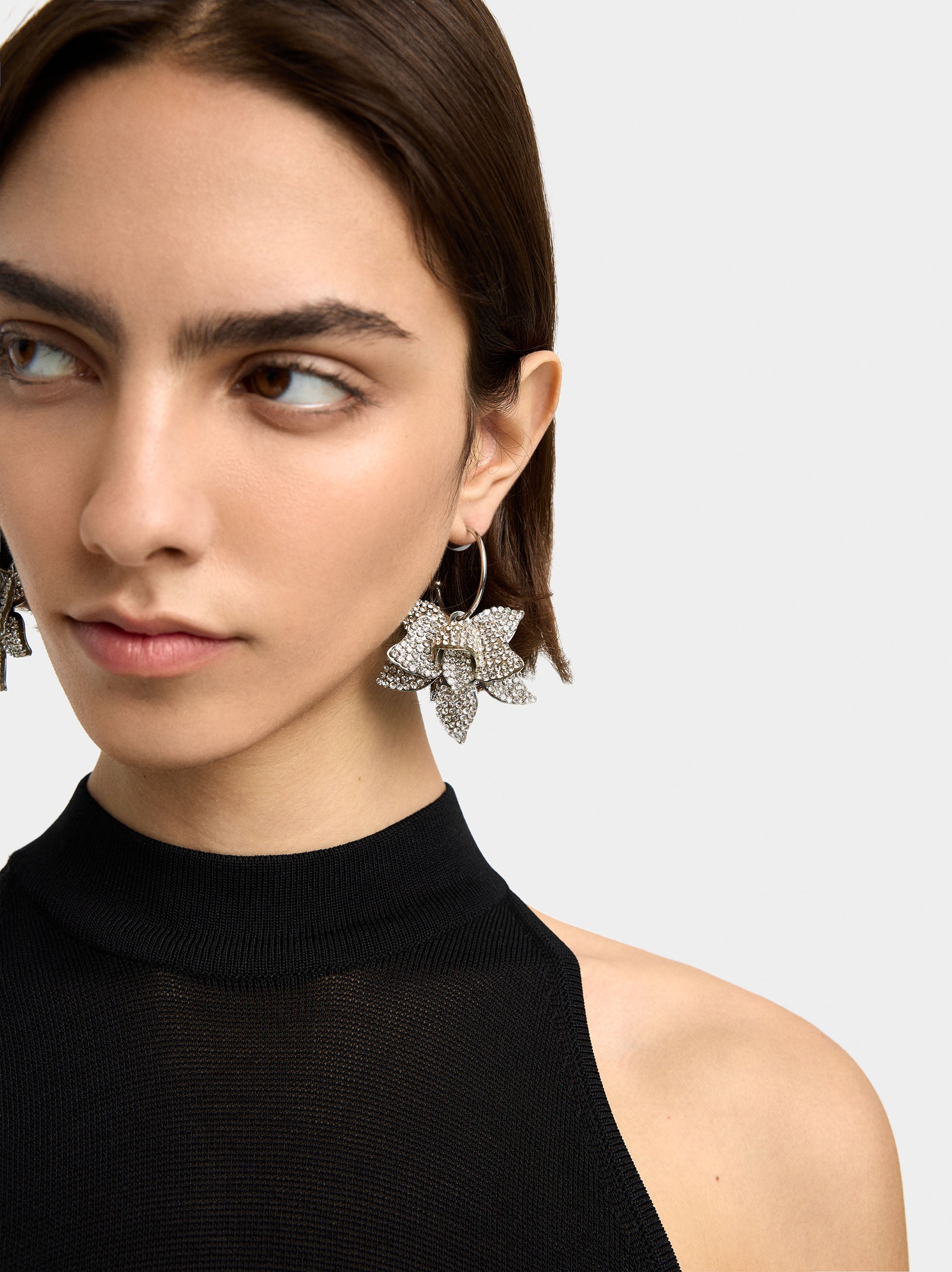 Aros abiertos con flor de tamaño maxi, enteramente cubierta de cristales. Acabado plateado.