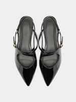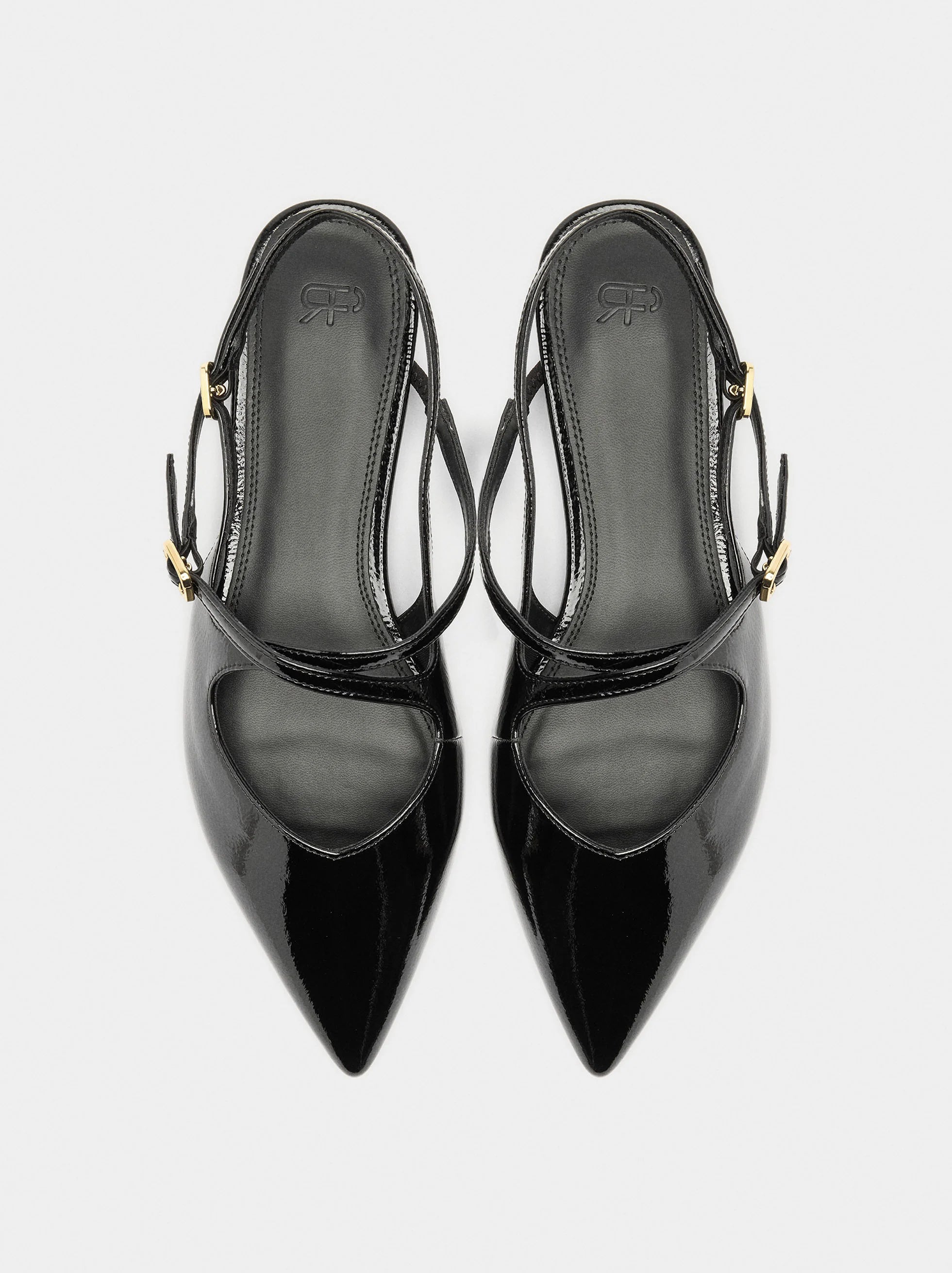 Bailarinas de charol estilo mule. Tiras cruzadas en el empeine y el tobillo, ambas ajustables con hebillas. Punta puntiaguda. Suela de goma.