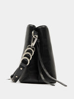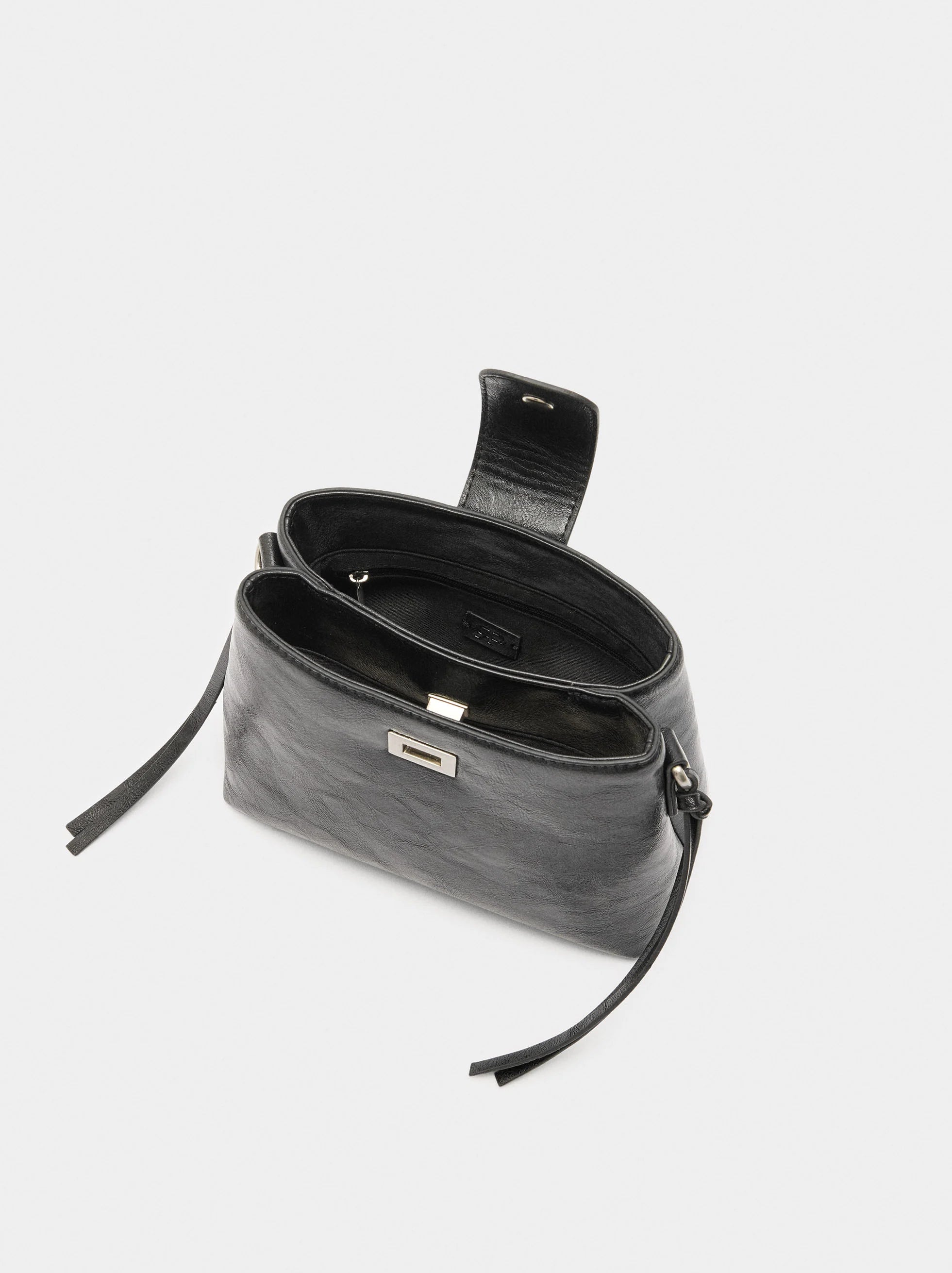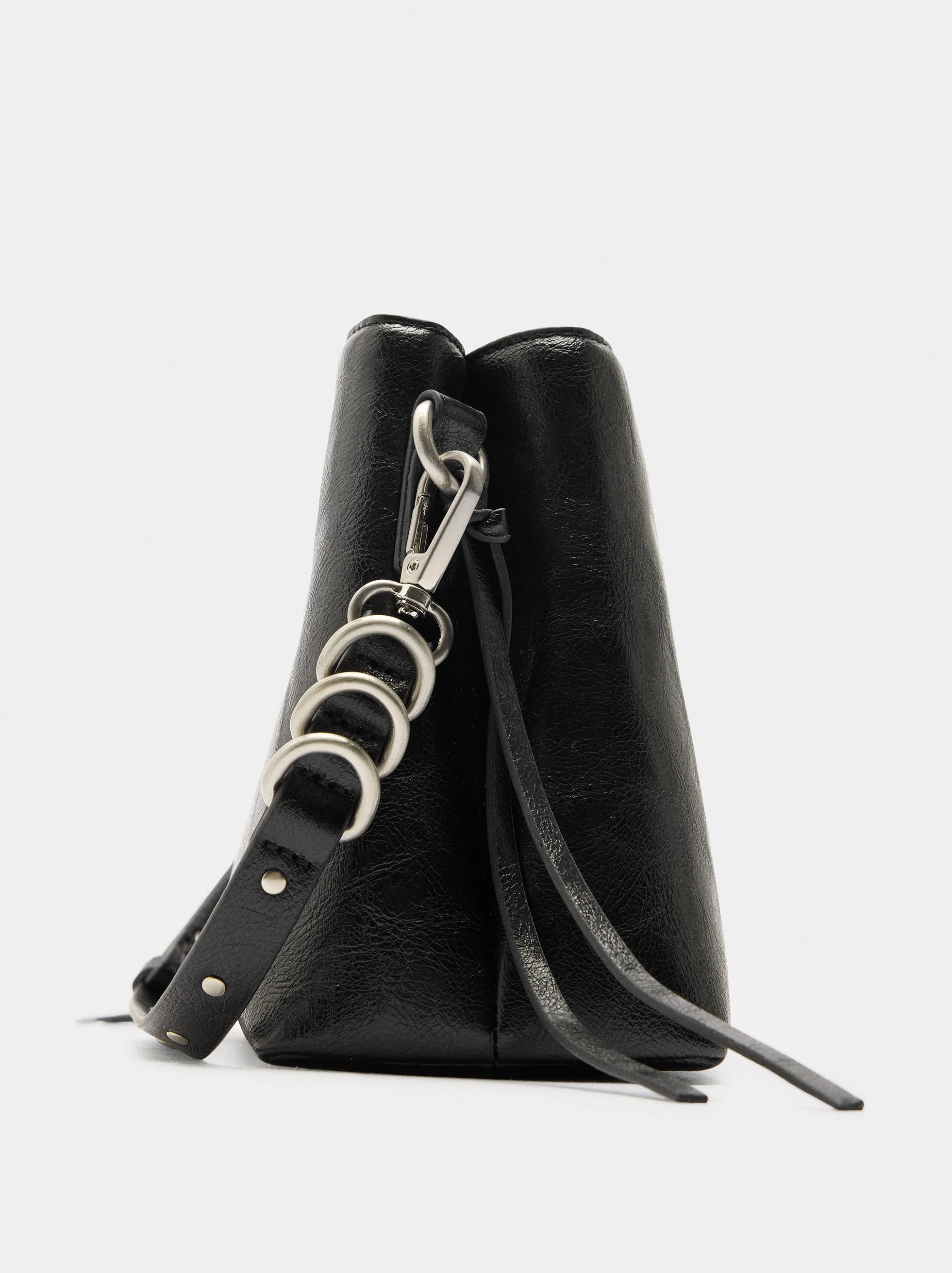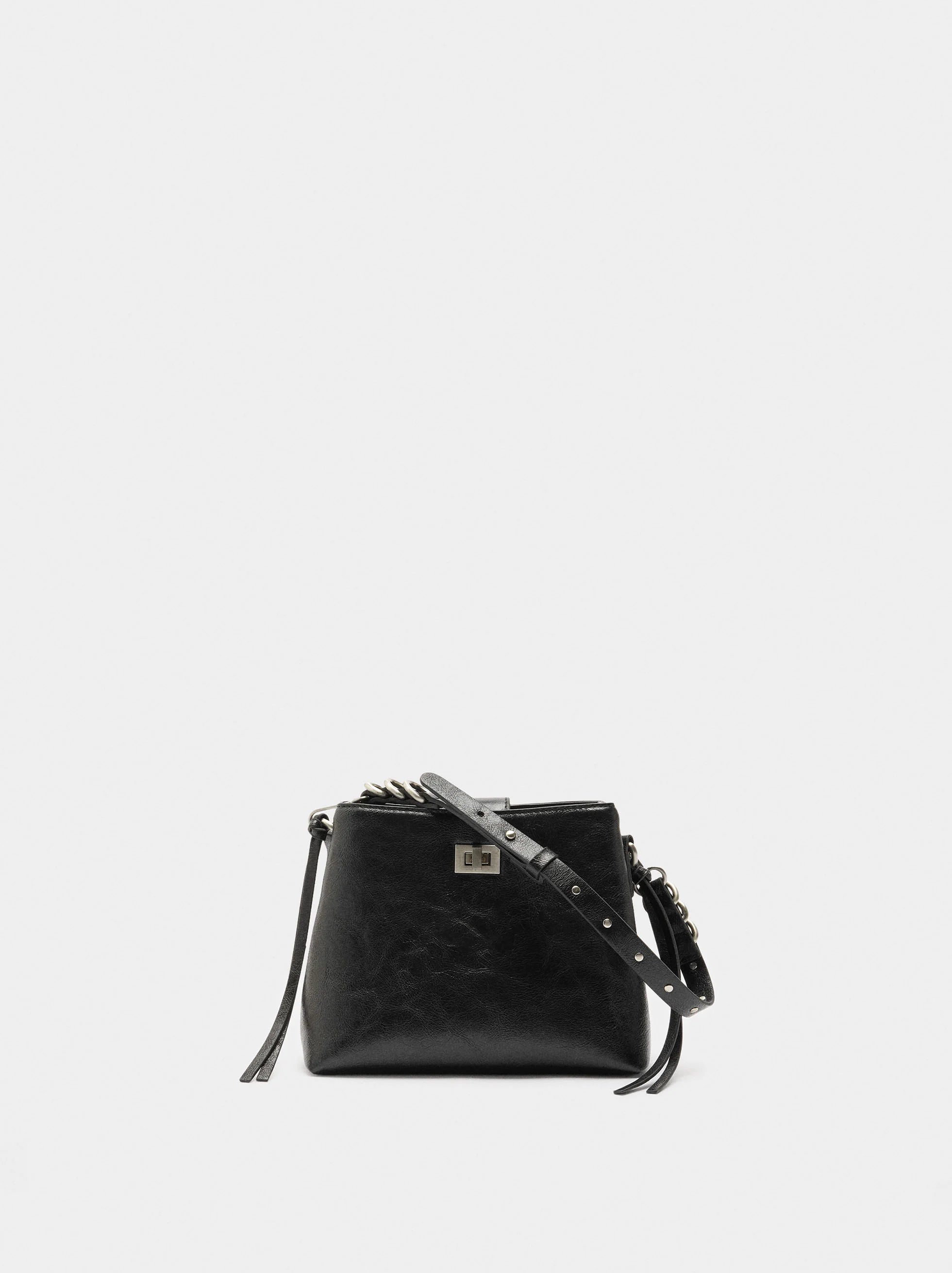 Bolso tote doble envernizado. Forro y bolsillo interior. Cierre giratorio y cierre con botón. Dos tirantes: uno corto con tachuelas, otro largo ajustable; ambos desmontables.