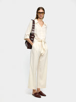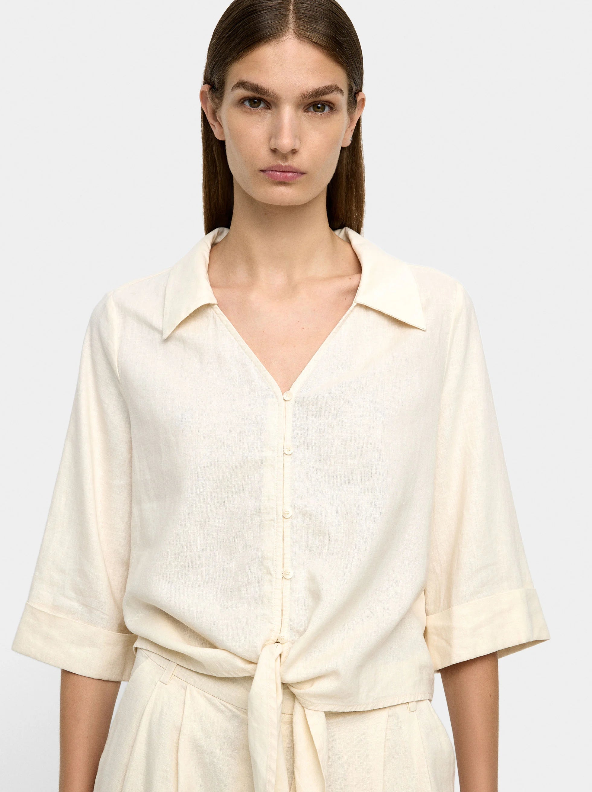 Camisa lisa confeccionada con lino. Cuello de solapa. Escote en V. Manga corta. Cierre con botones. Cintas para atar en la parte inferior. La modelo lleva una talla S y mide 1.79 m.