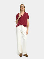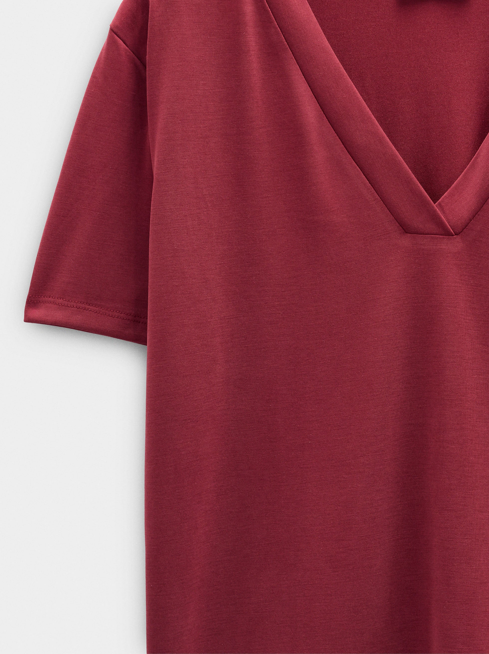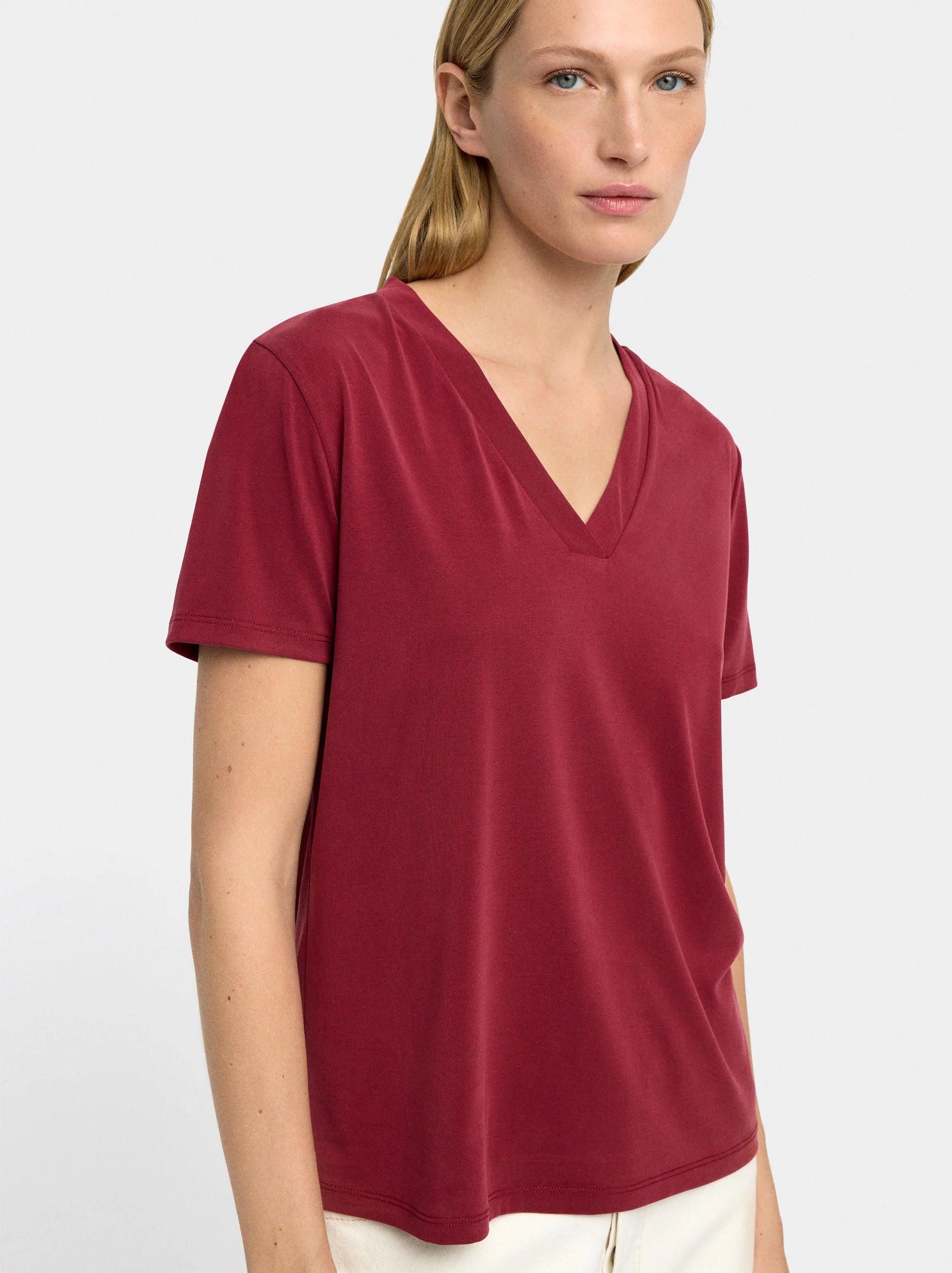 Camiseta básica con escote en pico. Manga corta. La modelo mide 1,76 m y lleva la talla S.