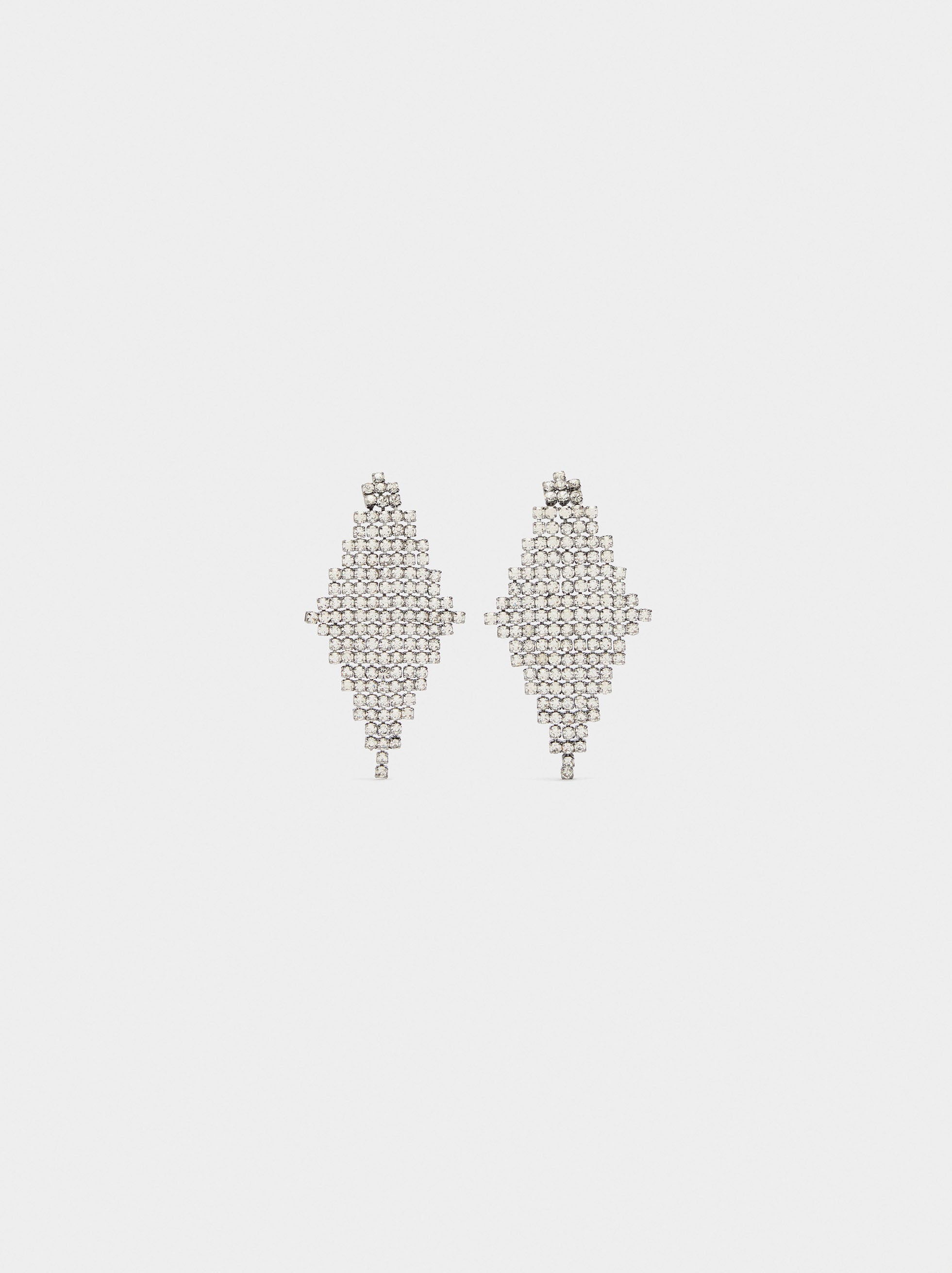 Pendientes maxi en forma de rombos con cristales. Flexibles. Acabado plateado.
