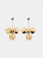 Pendientes maxi largos con barra y flor con relieve. Base en forma de media esfera extraíble. Acabado dorado brillante.