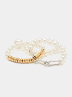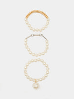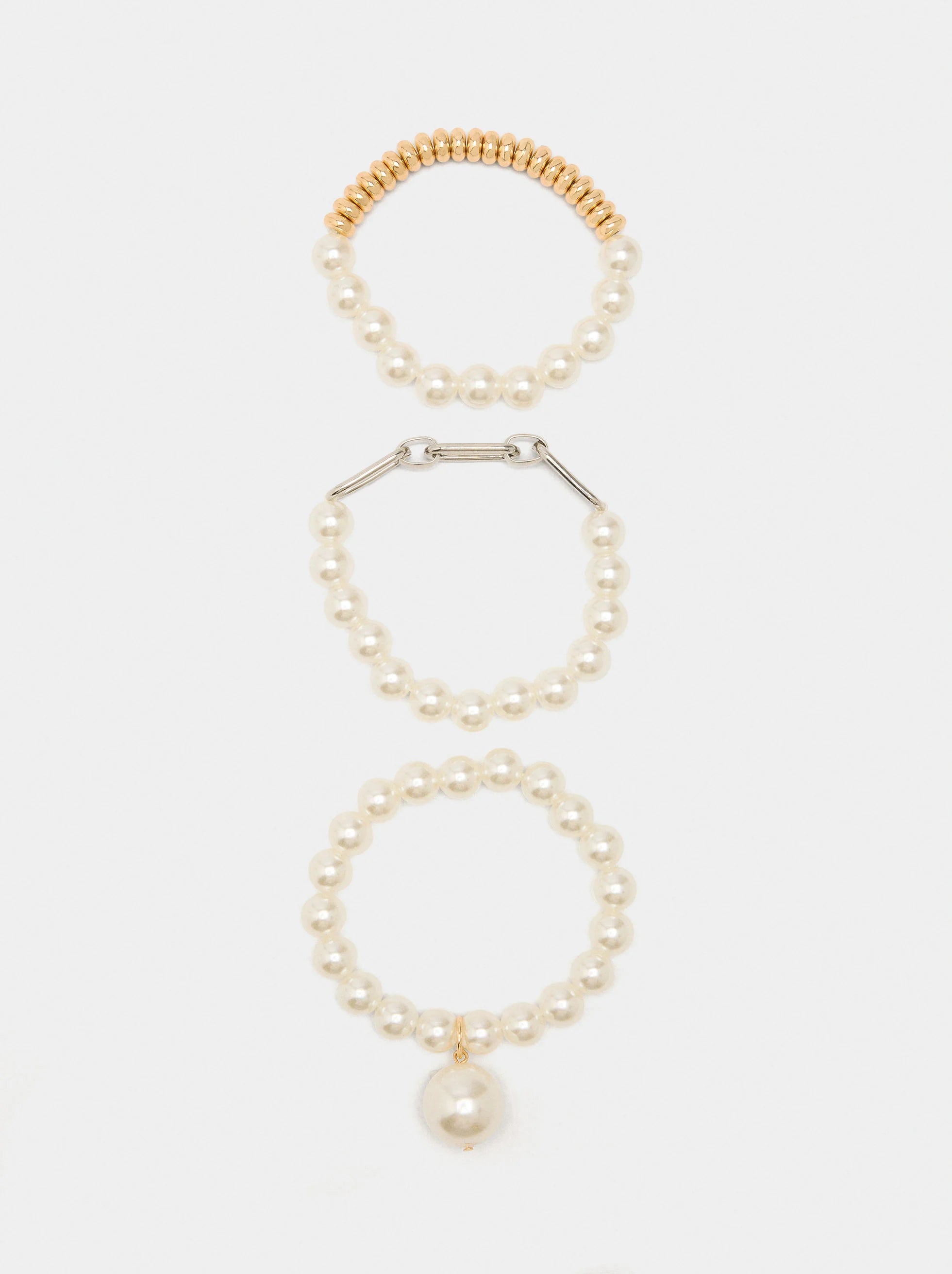 Set de tres pulseras elásticas con perlas, cuentas doradas, eslabones alargados y colgante de perla. Acabado dorado y plateado.
